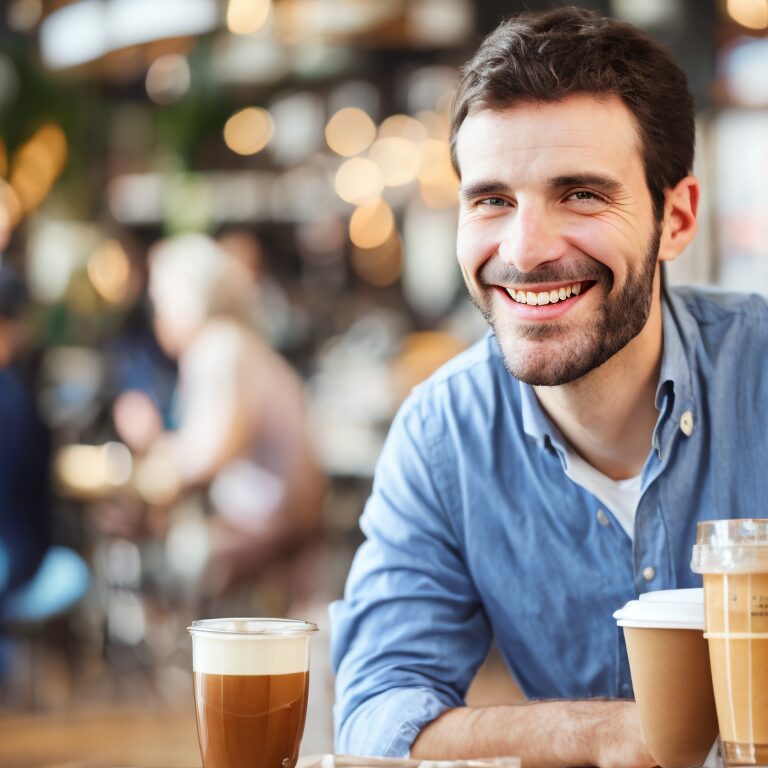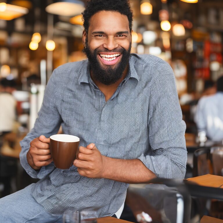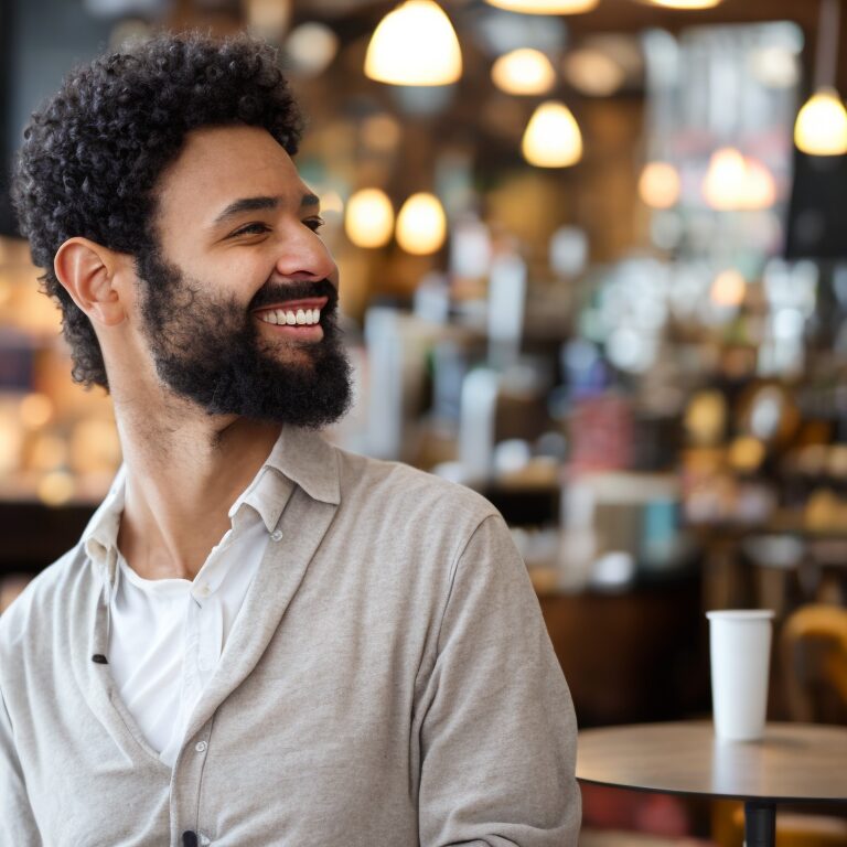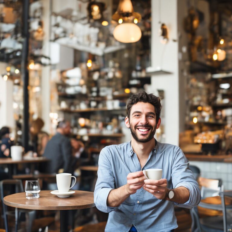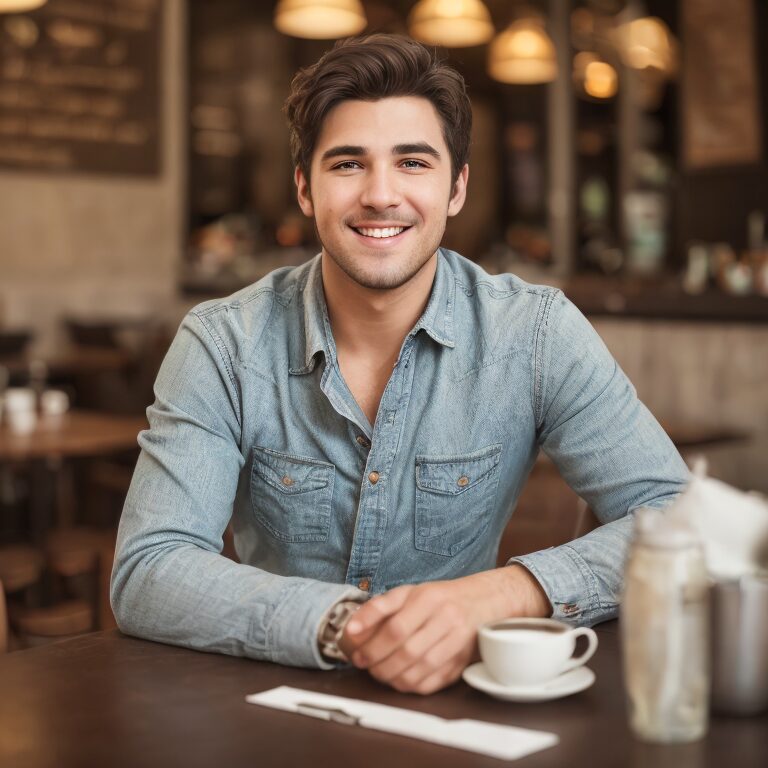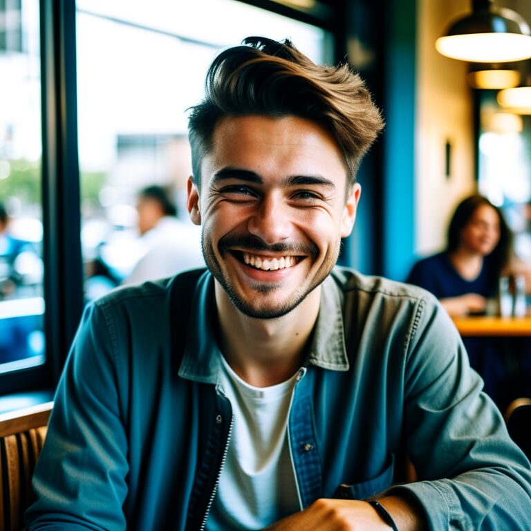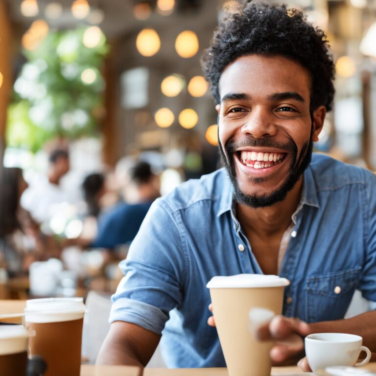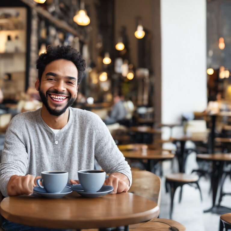 Prompt: A guy in a cafe, smiling (Um homem num café, sorrindo)