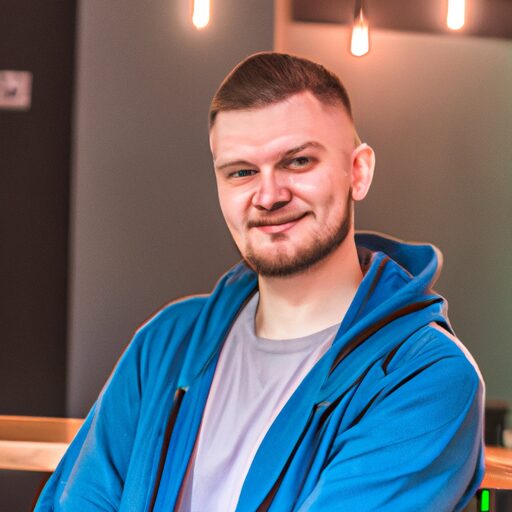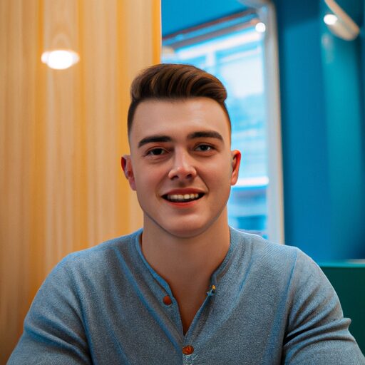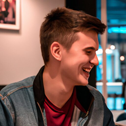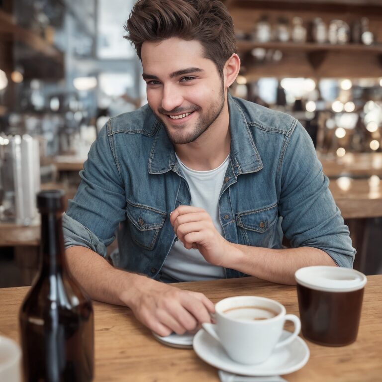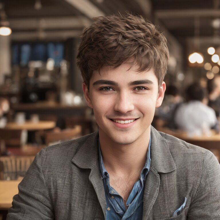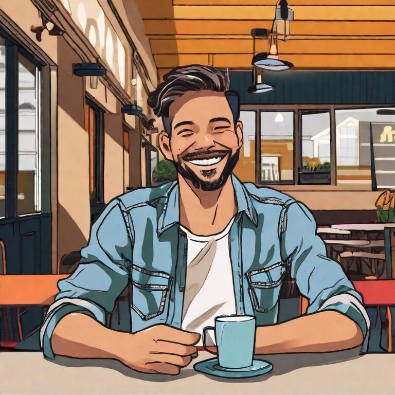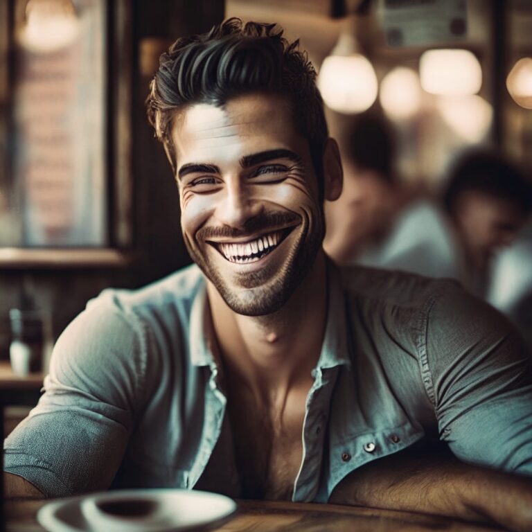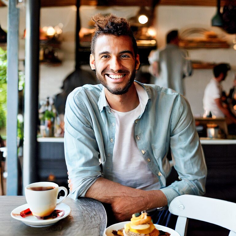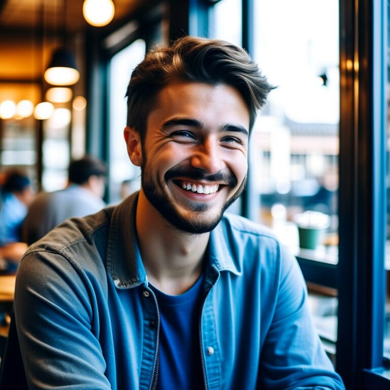 Prompt: A guy in a cafe, smiling (Um homem num café, sorrindo)