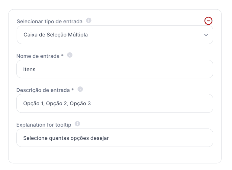 Caixa de Seleção Única: se você deseja limitar a resposta do usuário de uma entre uma lista de opções, basta você inserir cada uma delas separando por vírgula na descrição da entrada.