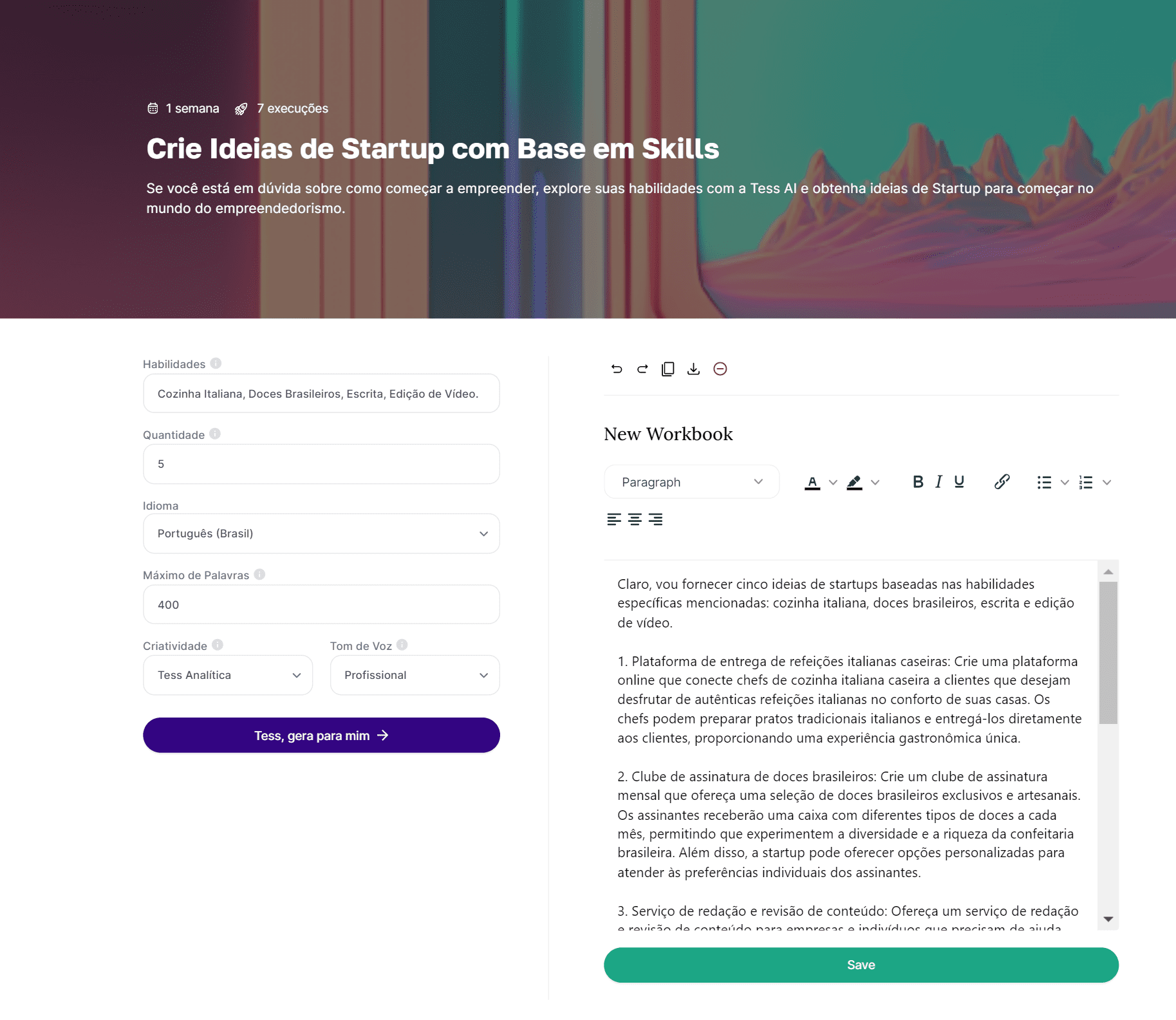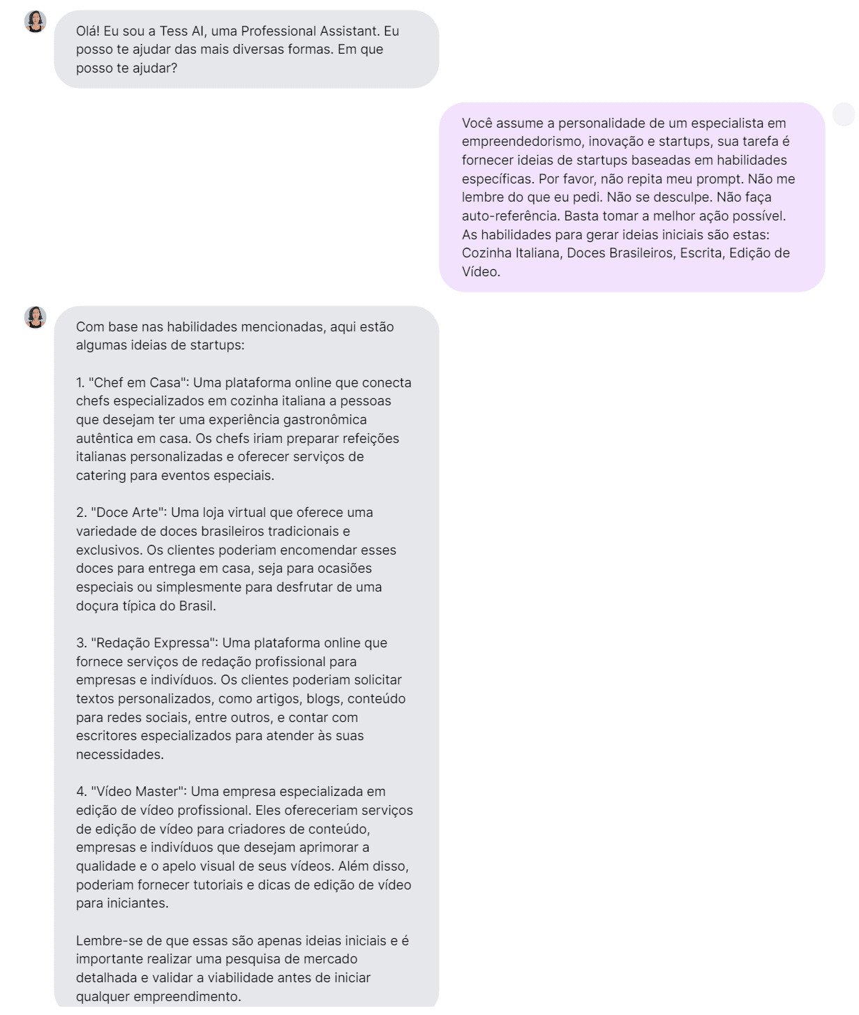 Após refinar, lembre-se de testar novamente com a Tess AI, para garantir que a lógica realmente funciona. Como pode ver a Tess AI gerou 10 ideias com base nas skills.