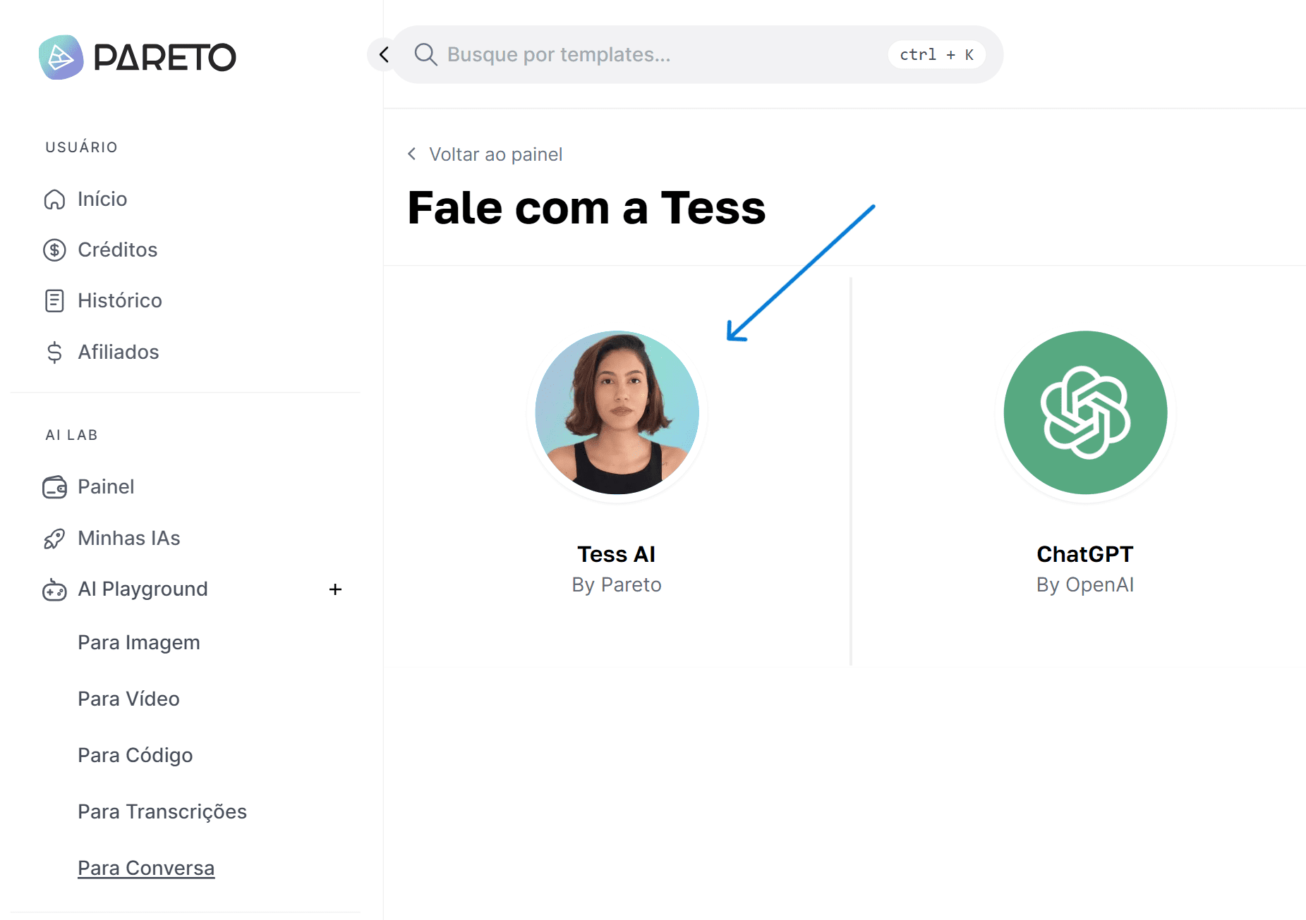Com o seu prompt inicial em mãos, basta testar a sua ideia com a ajuda da Tess AI, para isso, selecione “Para Conversa” no menu “AI Playground”