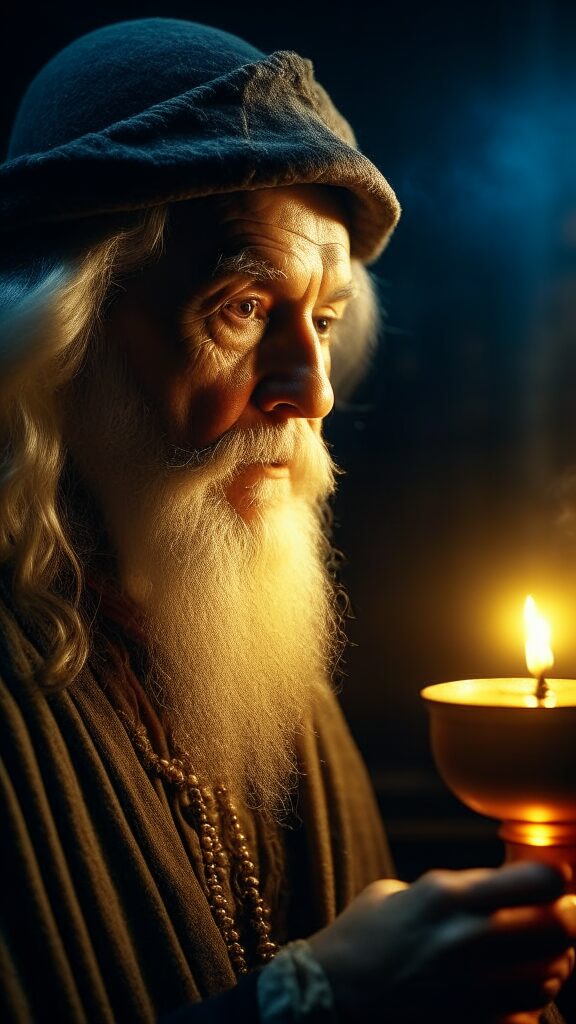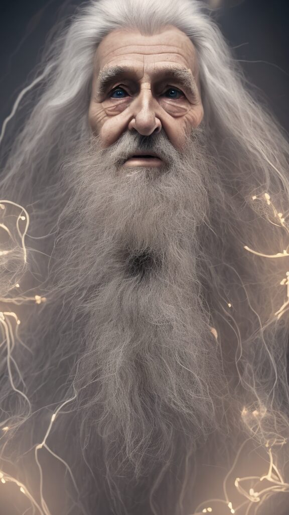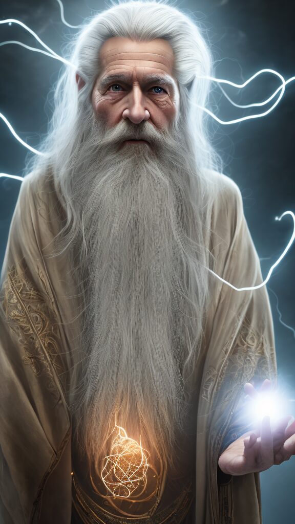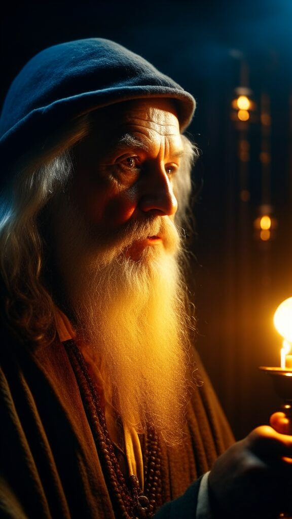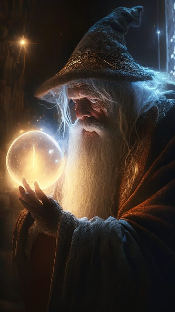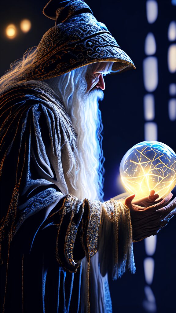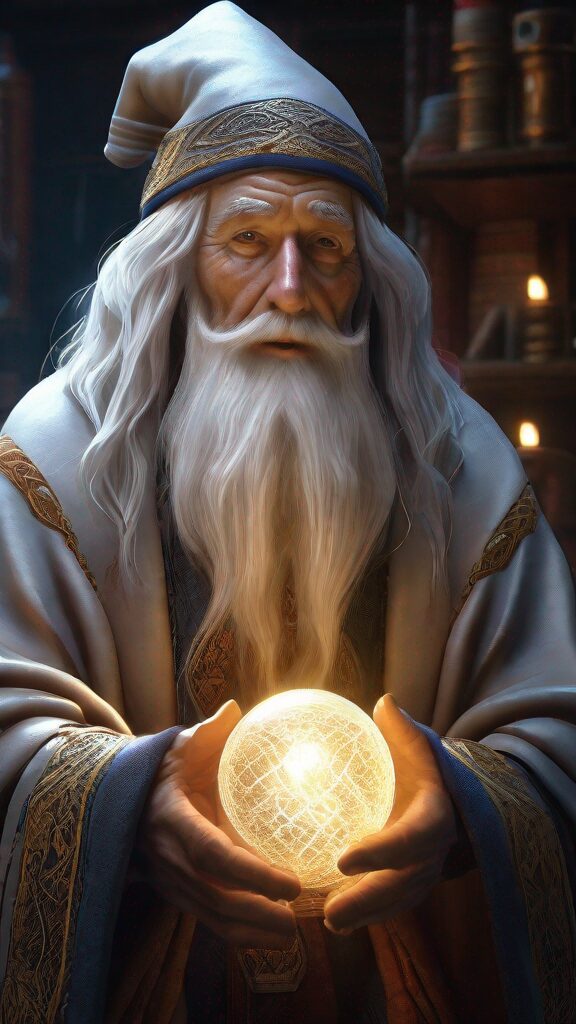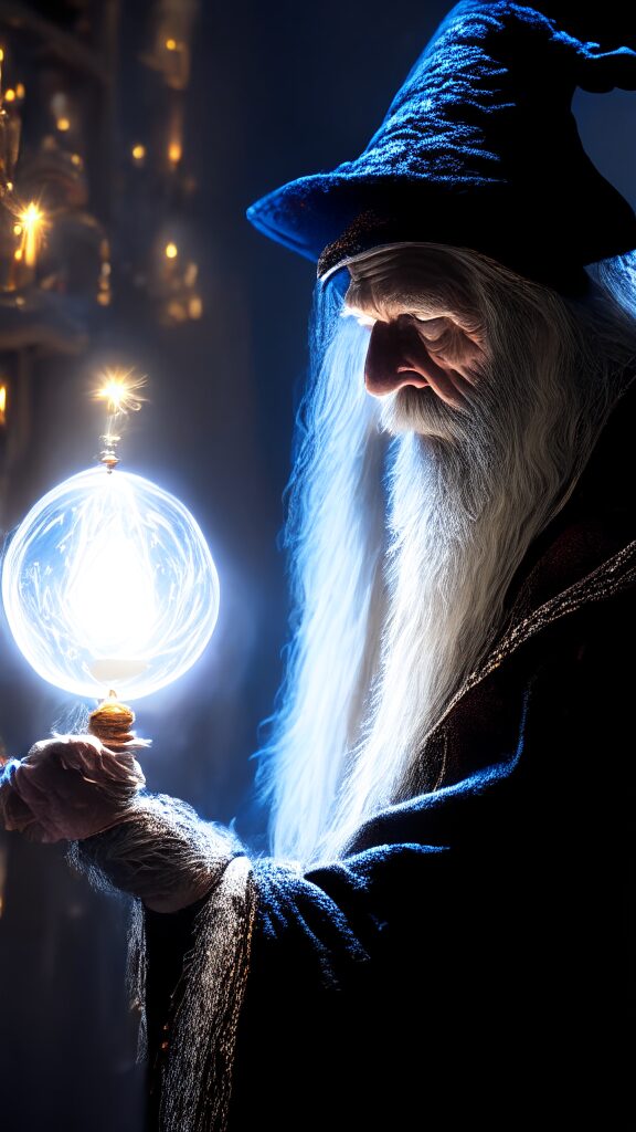 Translation: Masterpiece, best quality, detailed, UHD, cinematic lighting, sharp focus, old wizard with long white hair and beard, wearing a wizard's cloak and hat, reflecting on a glowing orb, in a dimly lit room, magician's room, bright lights, flashing lights