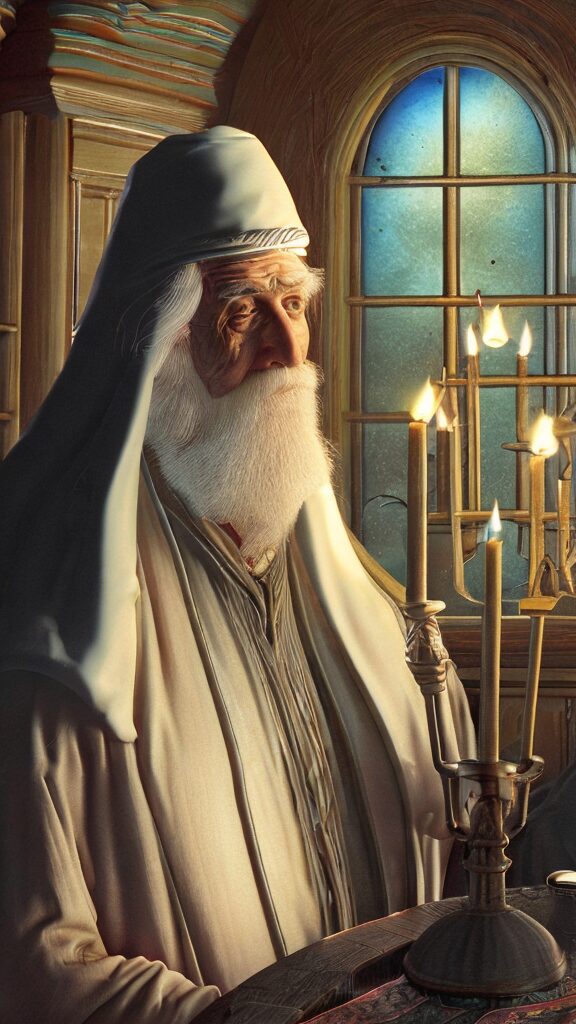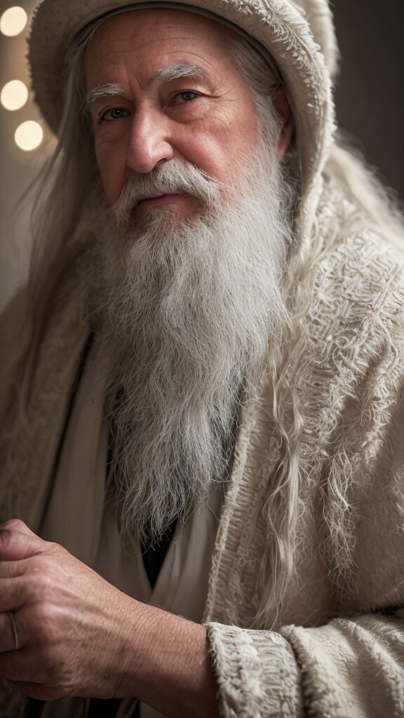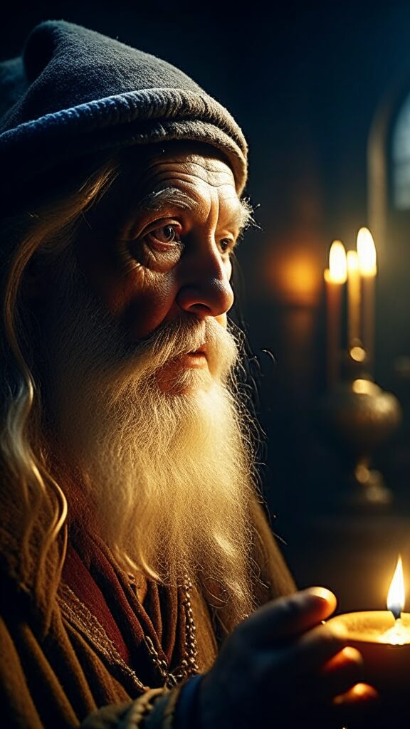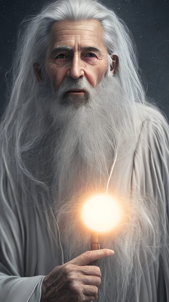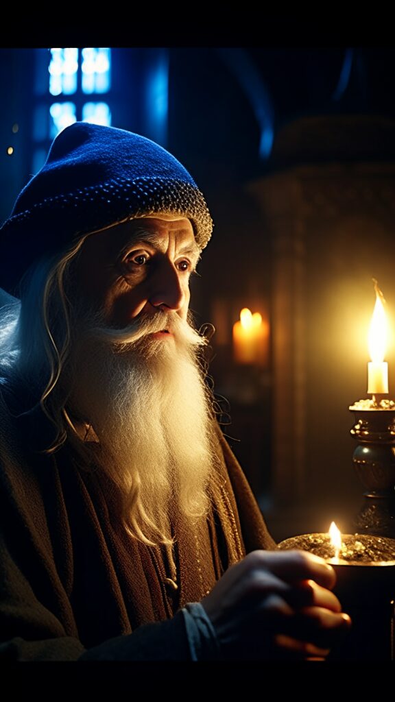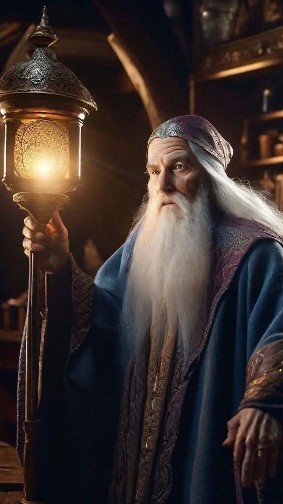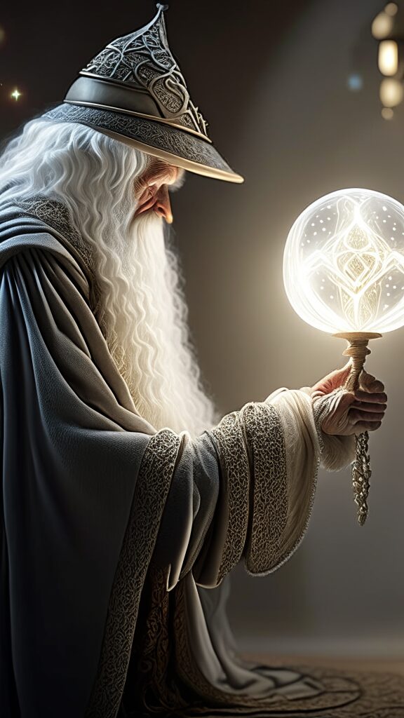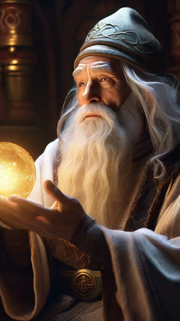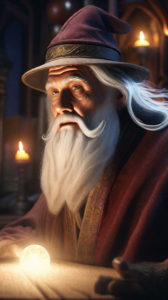 Prompt: Obra maestra, Mejor calidad, Detallado, UHD, Iluminación cinematográfica, enfoque nítido, ilustración, intrincado, Viejo mago con larga cabellera y barba blanca, vistiendo bata y sombrero de mago, reflexionando sobre un orbe resplandeciente, en una habitación tenuemente iluminada, habitación de mago, luces resplandecientes, luces parpadeantes